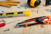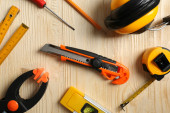 Flat lay composition with utility knife and different tools on wooden table
