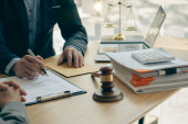 Businessman hand sign contract after lawyer providing legal consult dispute.