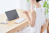 close up of a woman's hand operating a tablet PC in the room