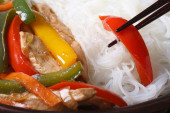 Kurczak i ryż makaron z pałeczkami. widok z góry poziome