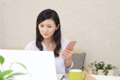 A woman who puts a tablet PC and operates a smartphone