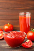 Delicious lecho in glass bowl and fresh ingredients on wooden table, closeup