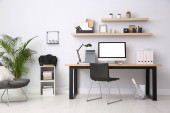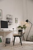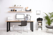 Wygodne krzesło biurowe w pobliżu biurka z nowoczesnym komputerem w pomieszczeniach