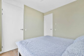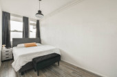 Komfortowe łóżko umieszczone w pobliżu zielonej ściany w nowoczesnym minimalistycznym stylu mansard sypialnia z oknami