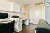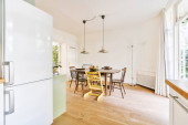Zdjęcie "Stół z krzesłami i kwiatami znajduje się w pobliżu salonu i kuchni w przestronnym pokoju współczesnego mieszkania" może być wykorzystywane do celów osobistych i komercyjnych zgodnie z warunkami zakupionej licencji Royalty-free. Obraz jest dostępny do pobrania w jakości wysokiej rozdzielczości do 5760x3840.