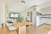Stół z krzesłami i kwiatami znajduje się w pobliżu salonu i kuchni w przestronnym pokoju współczesnego mieszkania