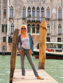 Atrakcyjny dziewczynka w okulary w pobliżu mury twierdzy
