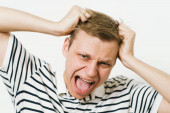 portret śmieszne młody człowiek z niesamowite fryzurę na białym tle na Zielone Świątki