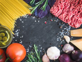 Składniki makaron Bolognese: spaghetti, mięso mielone, pomidory, b