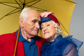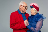 full length of cheerful middle aged groom and happy bride in wedding dress raising glasses of champagne on grey