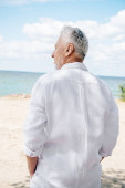 bearded middle aged man in suit with boutonniere posing near white curtains