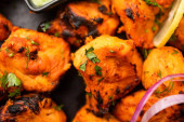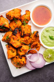 Tandoori Soya Chaap or soy chap dish prepared by marinating in tandoori spices, closeup view