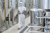 Supervisors talking about food products quality. In hands chart or check list. Supervisors supervising the process of beverage at the manufacturing .