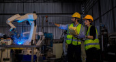 Supervisors talking about food products quality. In hands chart or check list. Supervisors supervising the process of beverage at the manufacturing .
