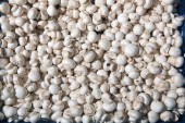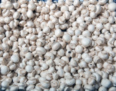 Factory for the production of canned champignons. Washing, conveyor, cleaning and packaging of champignons