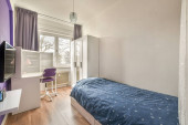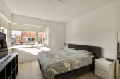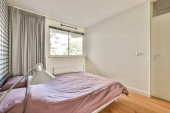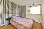 Łóżko nasłonecznione pokryte kocem w nowoczesnej sypialni z półkami i dekoracjami