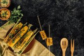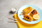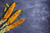 Sweet corn grilled with butter, cheese, cilantro and herbs. Vegetarian, healthy, clean eating barbeque food. Portioned bbq grill corn cobs on white background