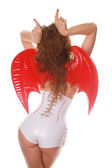 jasny młoda dziewczyna w kabaretki pomarańczowy strój, rajstopy w paski i pu gorset