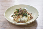 fried fermenting beef meat with pandan leaf on plate