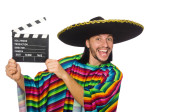 Zabawny człowiek w meksykańskim sombrero kapeluszu odizolowany na biało