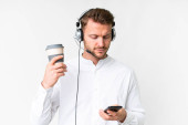 Telemarketer Brazylijczyk pracuje z słuchawki izolowane na białym tle trzymając kawę do zabrania i mobilny