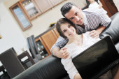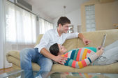 szczęśliwy, zabawy młodej rodziny i działa na laptopie w domu