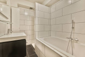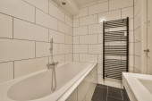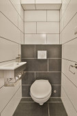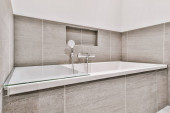 Stylowa łazienka wystrój wnętrz z białym WC i wanną ze szklanym prysznicem w nowoczesnym apartamencie