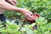 middle-aged blonde woman picks ripe raspberries in a basket, summer harvest of berries and fruits, sweet vitamins all year round. High quality photo