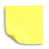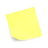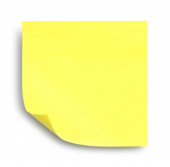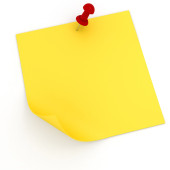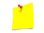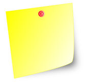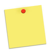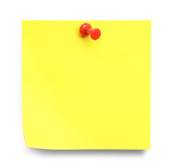 Blank yellow note pinned on white background, top view