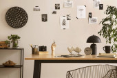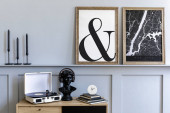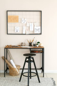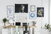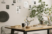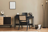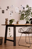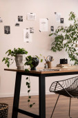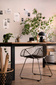 The stylish composition of cozy office interior with metal chair, wooden table, plants poster and personal accessories. Home decor. Template.