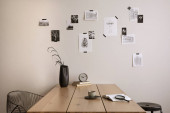 Zdjęcie "The stylish composition of cozy office interior with metal chair, wooden table, plants poster and personal accessories. Home decor. Template. " może być wykorzystywane do celów osobistych i komercyjnych zgodnie z warunkami zakupionej licencji Royalty-free. Obraz jest dostępny do pobrania w jakości wysokiej rozdzielczości do 5760x3840.