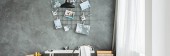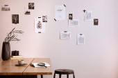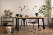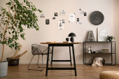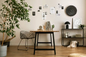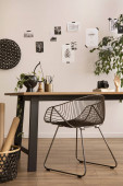 The stylish composition of cozy office interior with metal chair, wooden table, plants, pictures and personal accessories. Home decor. Template.