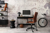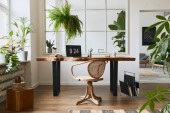 The stylish composition of cozy office interior with metal chair, wooden table, plants poster and personal accessories. Homne decor. Template.