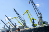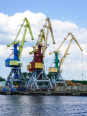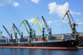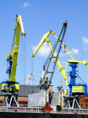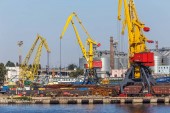 Bulk carrier with open storage tanks in port bulk terminal, port cranes painted in the colors of the Ukrainian flag with buckets ready for work