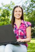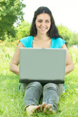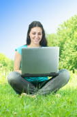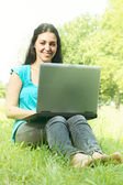 portret ładny dziewczyna leżąc na trawie w parku przy pomocy pewien laptop