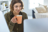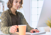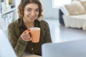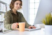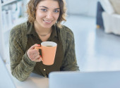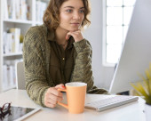 Atrakcyjna kobieta siedząca przy biurku, trzymająca filiżankę kawy.