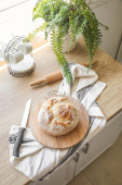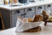 Cutting board with fresh bread and napkin on kitchen counter near light wall
