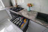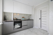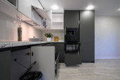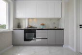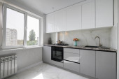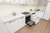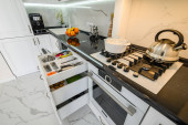 High angle view to white compact modern domestic kitchen furniture after renovation