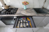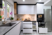 Zdjęcie "High angle view to white compact modern domestic kitchen furniture after renovation" może być wykorzystywane do celów osobistych i komercyjnych zgodnie z warunkami zakupionej licencji Royalty-free. Obraz jest dostępny do pobrania w jakości wysokiej rozdzielczości do 5760x3840.