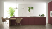 Japandi trendy wooden kitchen in white and red tones. Wooden cabinets, contemporary wallpaper and marble top. Minimalist interior design