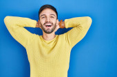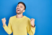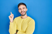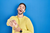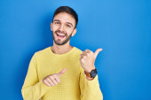 Zdjęcie "Hiszpan stojący nad niebieskim tłem uśmiechający się zdumiony i zaskoczony, wytykający palcami i podniesionymi ramionami. " może być wykorzystywane do celów osobistych i komercyjnych zgodnie z warunkami zakupionej licencji Royalty-free. Obraz jest dostępny do pobrania w jakości wysokiej rozdzielczości do 5760x3840.