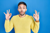 Hiszpan stojący nad niebieskim tłem uśmiechający się zdumiony i zaskoczony, wytykający palcami i podniesionymi ramionami.