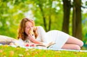 portret młodej dziewczyny z książek i jabłka w kratki w