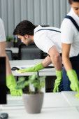 mężczyzna z maszyną do czyszczenia podłogi w pobliżu wielonarodowych kobiet myjących okna i meble