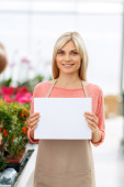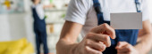 zamazana profesjonalna sprzątaczka pokazująca pustą wizytówkę uśmiechnięta do kamery