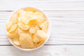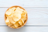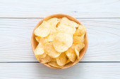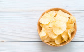 Papier z chipsami ziemniaczanymi na starym drewnianym stole, koncepcja wegetariańska