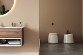 Blisko biały zlewozmywak z owalnym lustrem wiszącym na niebieskiej ścianie, nowoczesna szafka z kranem w minimalistycznej łazience. 3d renderowanie