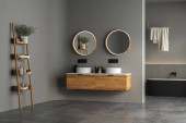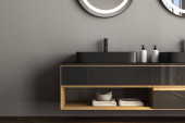 Zdjęcie "Blisko biały zlewozmywak z owalnym lustrem wiszącym na niebieskiej ścianie, nowoczesna szafka z kranem w minimalistycznej łazience. 3d renderowanie" może być wykorzystywane do celów osobistych i komercyjnych zgodnie z warunkami zakupionej licencji Royalty-free. Obraz jest dostępny do pobrania w jakości wysokiej rozdzielczości do 5760x3840.