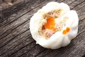 Steamed buns with minced pork filling and Pork shumai or Chinese steamed dumpling on old wooden background. Chinese Dim Sum. Space for text, Selective Focus.