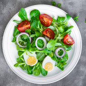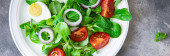 green salad egg, vegetable tomato, onion, leaves lettuce mix fresh healthy meal food snack on the table copy space food background